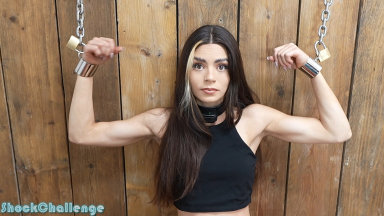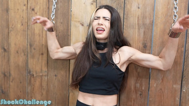River is back for a new challenge, requested by a member. She will try much higher shock levels than ever before! First, she chains herself to the wall and prepares for what’s to come. River is so strong!!!